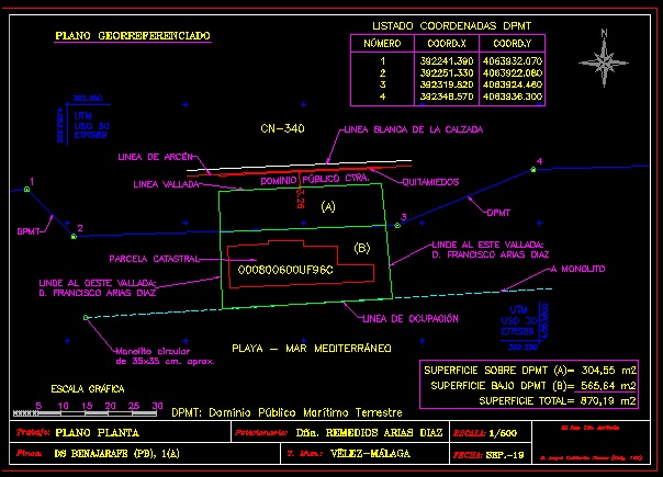 Otro plano que se incluye, imprescindible es la superposición de la parcela medida con la ortofoto de fecha mas reciente en color, superponiendo además en distinto color, la parcela catastral actual para observar los posibles errores, lo que ayuda a interpretar los planos.